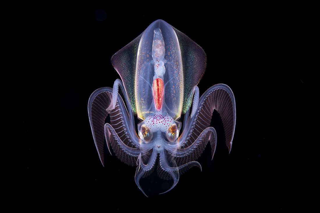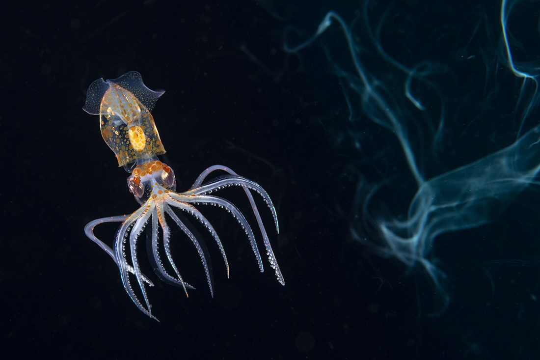 To get this 4-inch-long diamond squid (Thysanoteuthis rhombus) lit up like this require the dual lighting from two reasonably powerful underwater strobes.