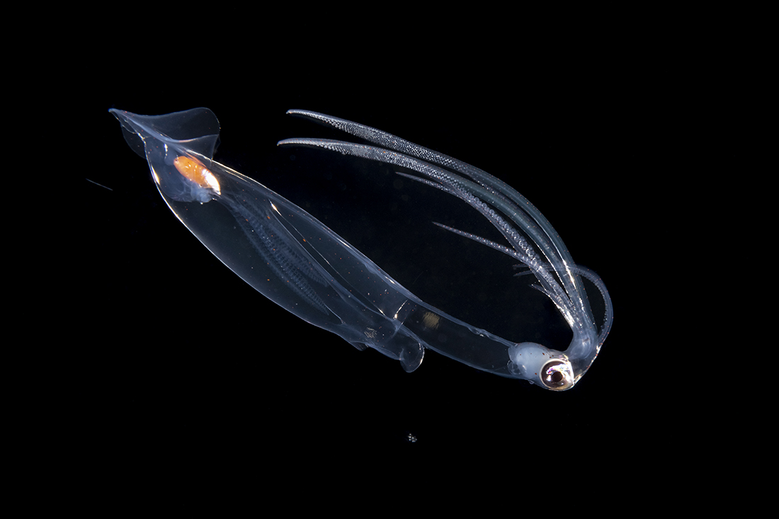 Deep water species of squid like this longneck squid transparent bodies suit them for camouflage in their sun less world, at the same time makes them hard to properly light up when photographed. To get this fellow, I had to almost place the strobes backlight it.
