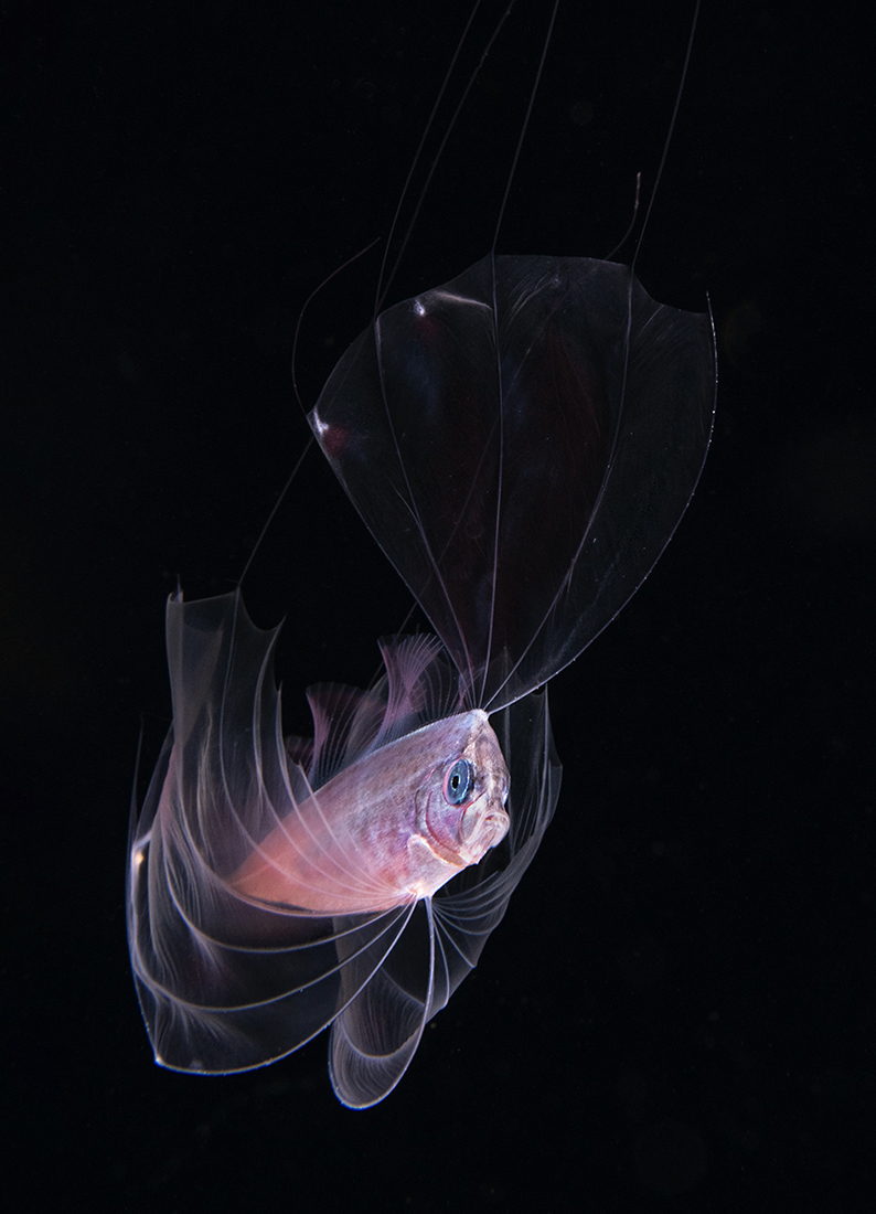 Tripod fish (Bathypterois grallator) prominently sit at the top of the list for nearly everyone who get serious about blackwater diving. During their larval to early juvenile phase, these deep-sea benthic fish can present a challenge to photograph. The most effective is to place your strobes so that they are nearly facing each other.