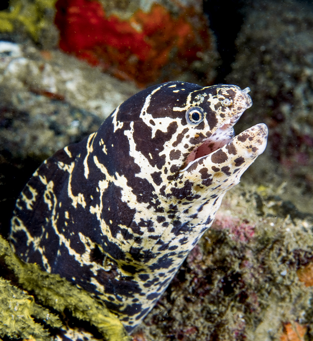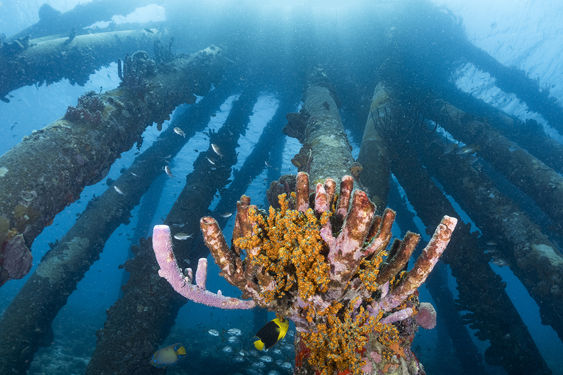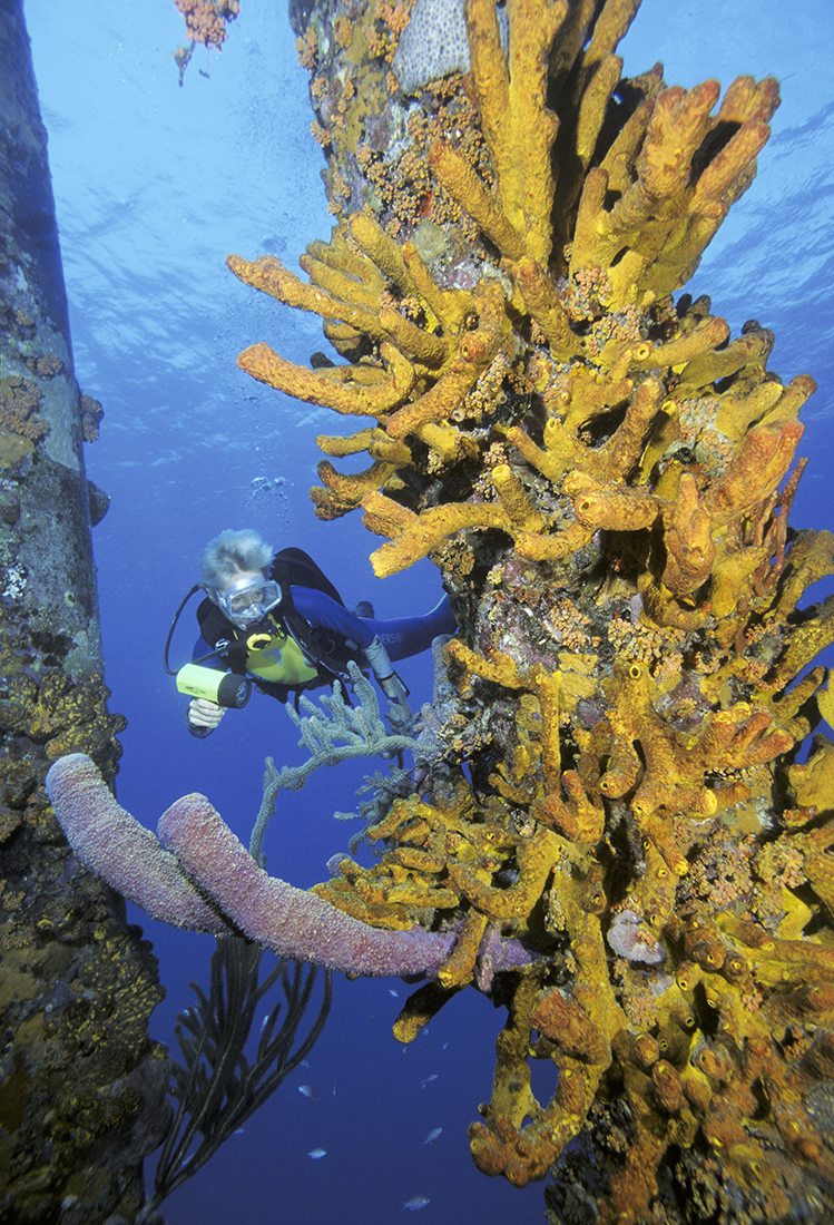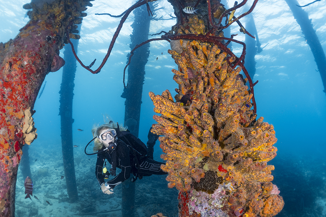 At this point, the pier forms a massive T-shape concourse of concrete and steel pilings spanning north and south. Below the surface, the pilings drop to a depth of 50 feet along the edge of the reef slope. Seen from underwater, the pier’s network of 3-foot diameter columns, resemble a forest of pine trees vaulting skyward. Adorning the huge round supports is a rich carpet of corals and sponges that create a bold montage of colors sometimes seeming to glow in the sunlight.