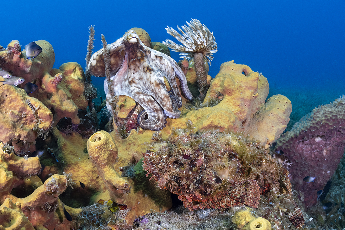 This CFWA shot of a common octopus perched atop a yellow tube sponge, with an Atlantic spotted scorpionfish (which you might have missed at first) below it, was taken with a full-frame fisheye. Between the lens’ super-short minimum focus and forced perspective, I was able to include enough of the ecosystem they live in with the two subjects.