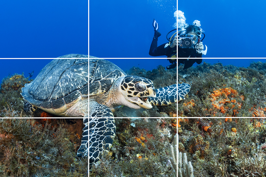 Looking at the grid, most of the sea turtle falls into two of those zones, with the focal point of the diver with a camera in the third, helping the eye track its way around the image and find things that create a triad within those nine zones.