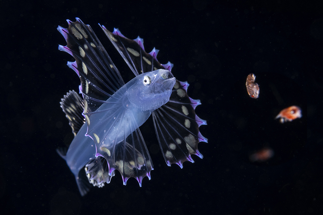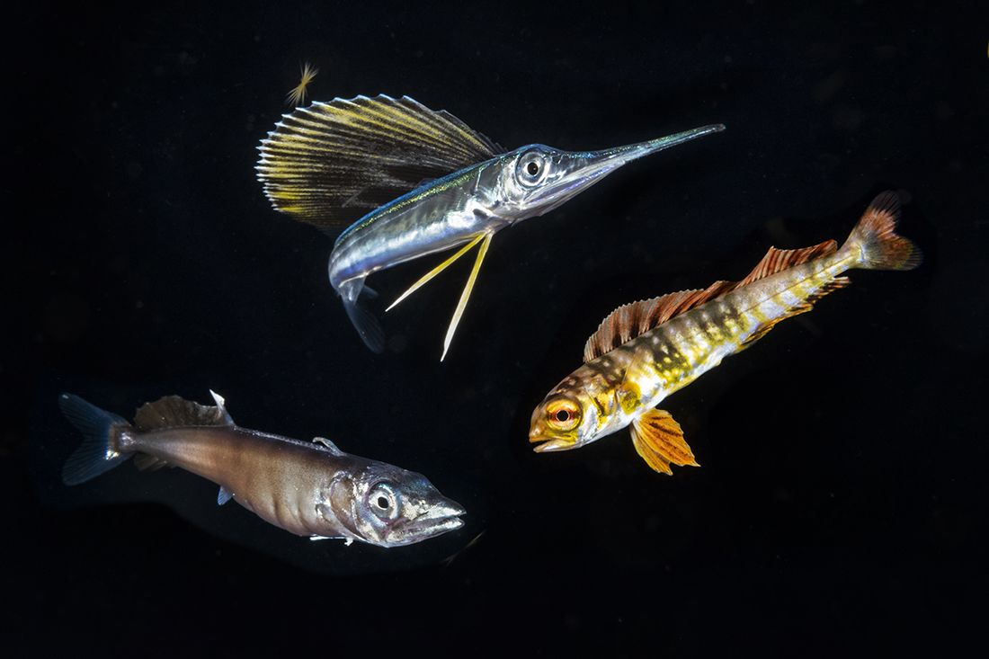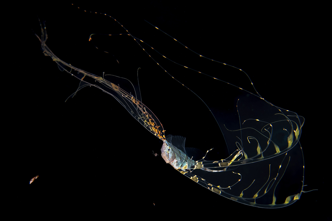 Then there are the deep dwellers, subjects previously known only to deep sea exploration like tripod fish, velvet whalefish, ribbon fish, cusk-eels and deep-water anglerfish. Some subjects carry real headscratcher names like bony-eared assfish (Acanthonus armatus) snaggletooth stareater and snaketooth swallower. Transparent, and at times quite elaborate during their larval stages of development, these strange looking fish are far removed from what they look like as adults.