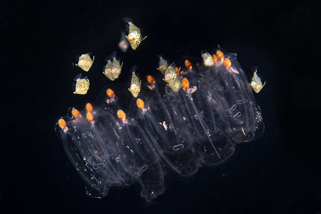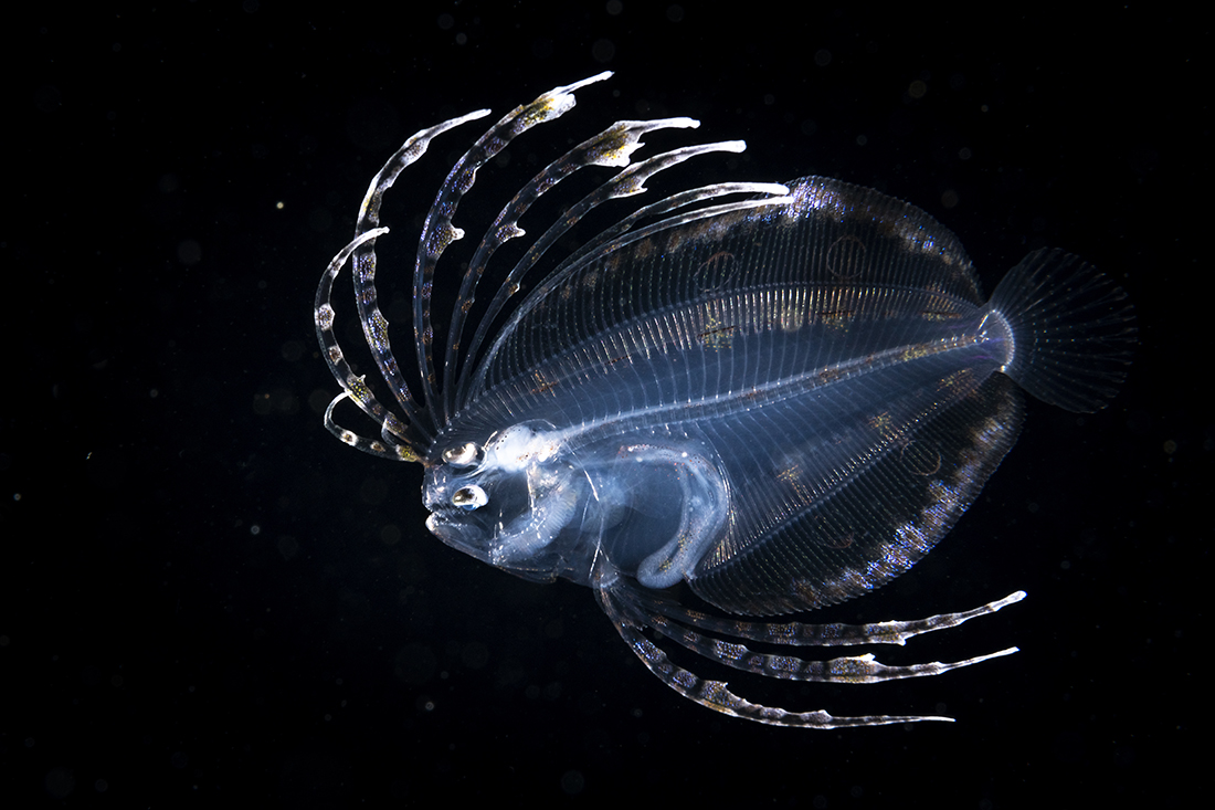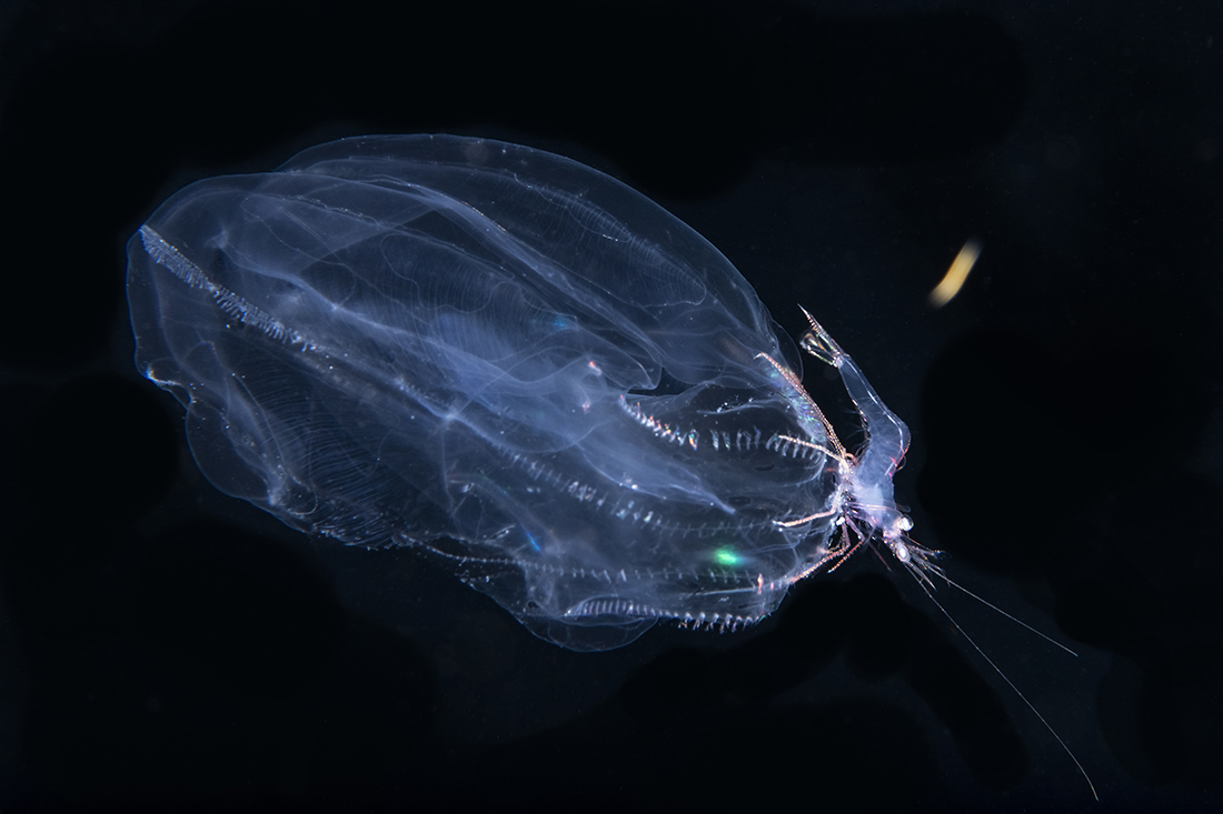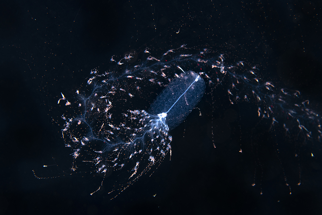The variety of marine life we find in this pitch-black realm includes an almost unimaginable litany of shapes and forms, the majority of which are seldom larger than a fingernail. The most common subjects seen on blackwater dives are small gelatinous creatures like comb jellies (Ctenophora), colonial Siphonophores and salps, sea butterflies and even tiny thimble shaped acorn worms floating as freely as the divers in the water column. Some of the more tantalizing prizes might include small pelagic squid, octopuses to flatfish like flounder, sole, and tonguefish.