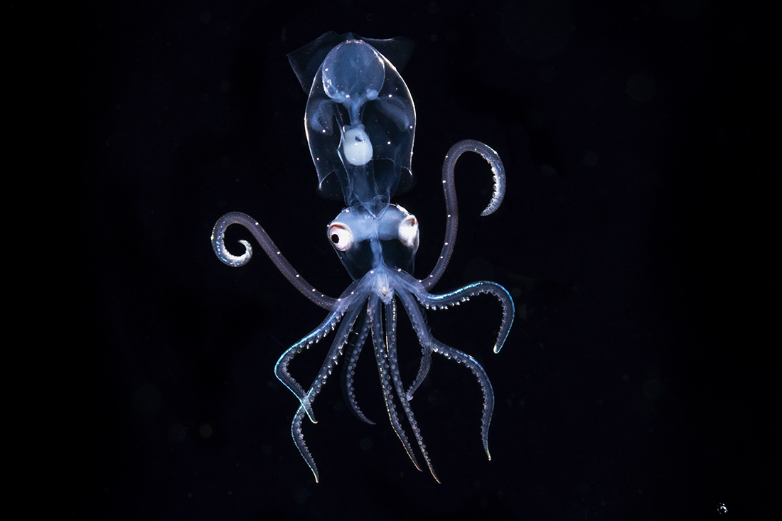Sharpear enope squid (Ancistrocheirus lesueurii) is a deep-water species found in the mesopelagic depths (200–1000 m down) throughout the oceans tropical and subtropical regions of the world. During the night they are among the wide variety of cephalopods that make the journey to shallower depths where divers are very likely to see them, provided your eyes are sharp enough to spot them as they are generally quite small.