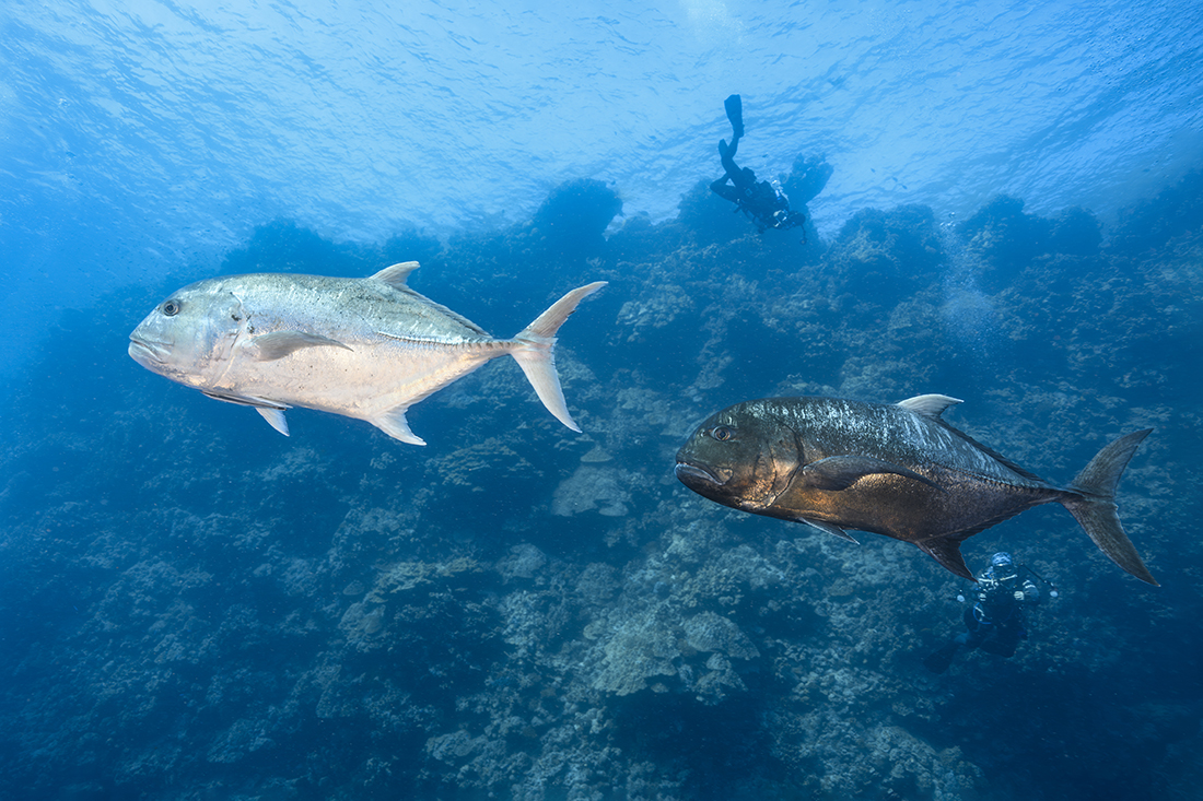 On other dives, the peak of the action amounted to a sizeable school of blackfin barracudas to hefty Giant Trevallies cruising along the wall of the reef. For the record, the Giant Trevally is the largest member of the jack family (Genus Caranx) which can obtain a maximum length of 67 in / 170 cm coming in around 176 lbs / 80 kgs.