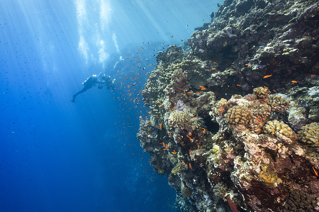 Laying a little further offshore Rocky Island and Zabargad not only took on a more dramatic set of profiles, starting again at zero feet from the surface, Rocky Island feature a vertical face that plunged well past 131 ft / 40 m whereas neighboring Zabargad Reef’s contours were more like a giant stair step, dropping almost straight down to a broad shelf at 32 ft / 10 m – 82 ft / 25 m before dropping off into blue.