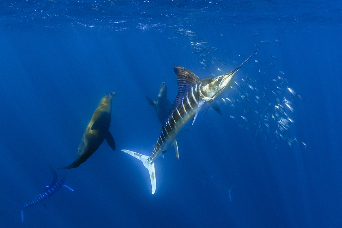 Along the southwest Pacific coast of Mexico’s Baja Peninsula seasonal upwellings of cold water meet and mix with warmer surface waters, creating a nutrient-rich slurry. Vast schools of migrating sardines, anchovies and small mackerels feed on this aquatic buffet as they migrate down to the sheltered waters of Magdalena Bay, which is one of their key spawning grounds. This mass migration in turn lures opportunistic apex hunters – billfish, sea lions, dolphin, whales and the occasional shark. What follows is an orgy of predation that mirrors the more famous South African Sardine Run and is every bit as spectacular.