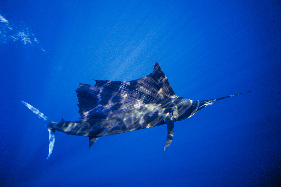 From the tip of their bill to the fork of their tail, a full-grown sailfish can measure up to 11 ft. / 3.3 m length. When viewed from the side they can look as weighty as a striped marlin, but don’t let that fool you. Seen from above their streamlined bodies are actually slenderer giving them a willowy build. The Indo-Pacific sailfish is considered one the fastest fish in the sea capable of reaching 68 miles / 110 kms per hour. Not only can they surpass the top speed for a cheetah they can do it for a much greater distance.