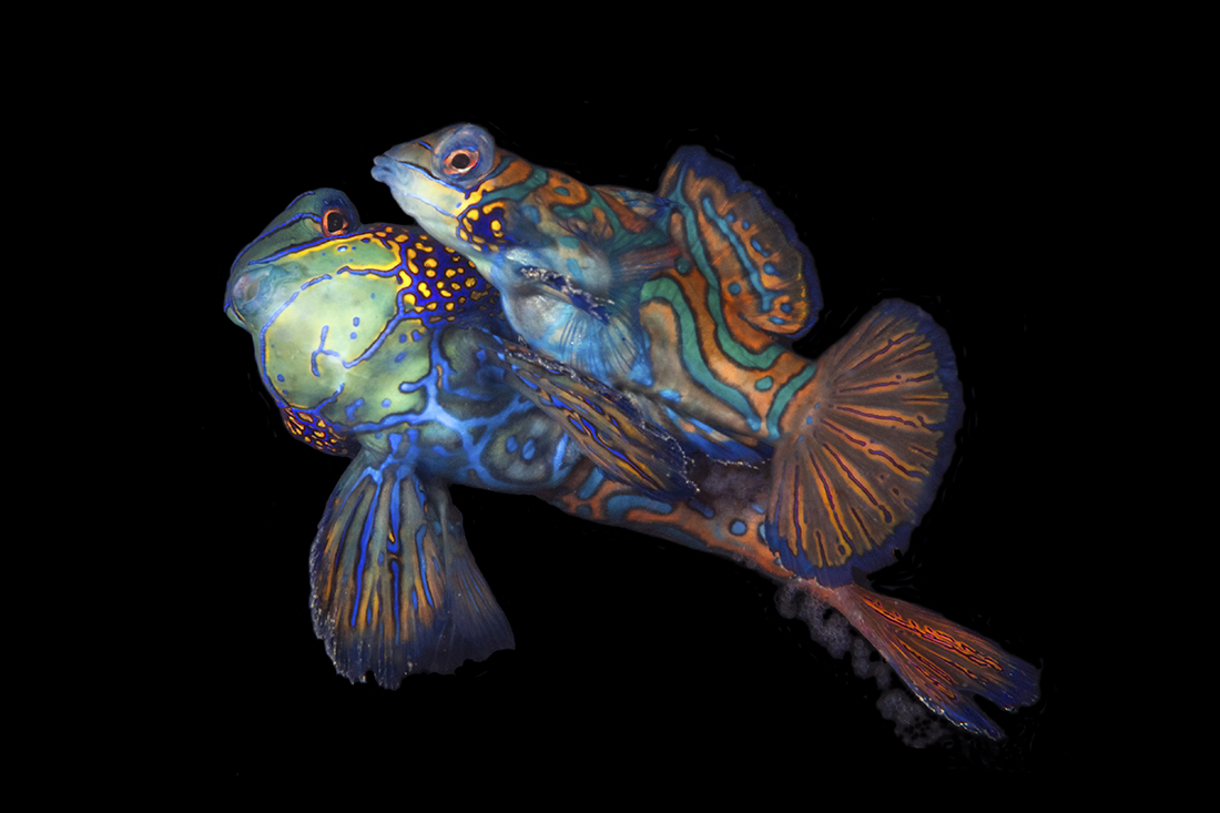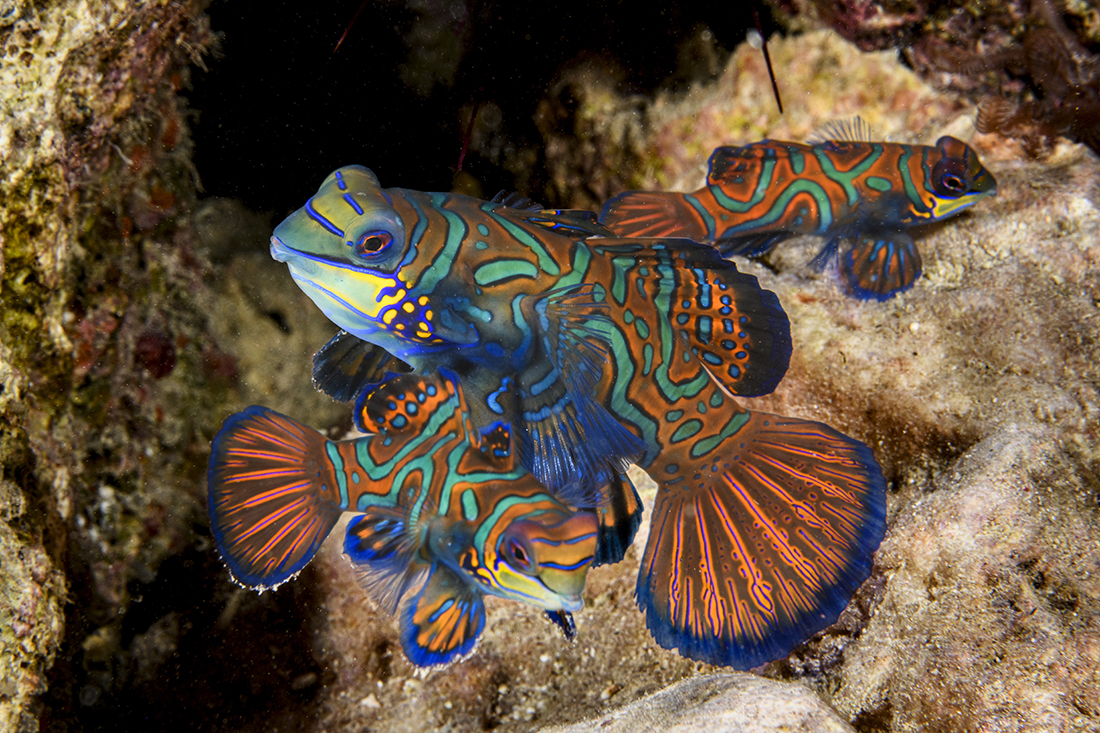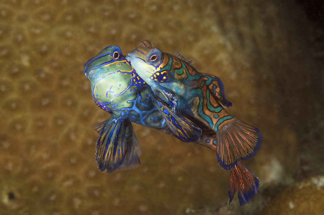 Keep in mind that when mandarinfish are about to mate they will rise upwards a foot or more above the coral. To catch the peak of action you need to be patient and wait for them to reach the zenith of their ascent. By this point they are often too connected to break apart before mating has actually occurred.