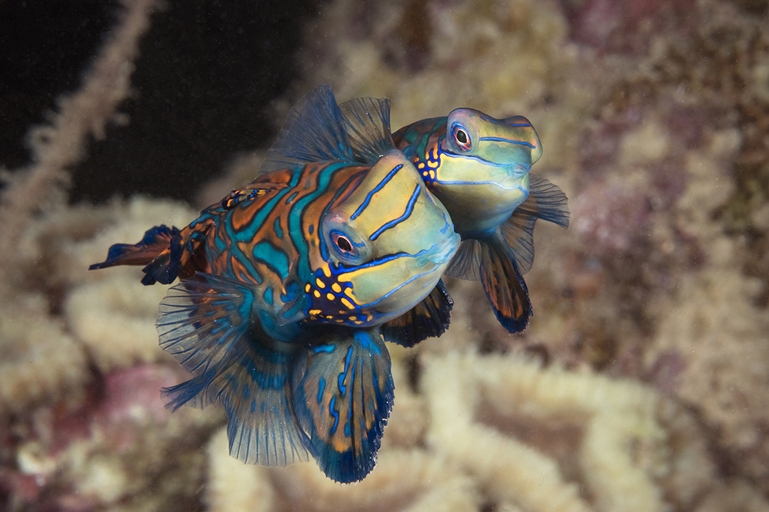 If you have succeeded in finding the right place to be before the drama starts to play out, you should not need to move from that spot as the mandarinfish courting behaviors will tend to work in a more vertical direction. Knowing that in advance helps you better track the fish through the viewer.